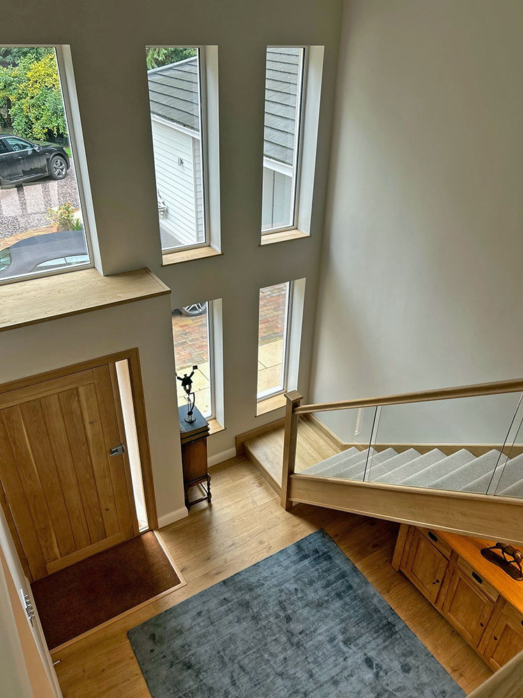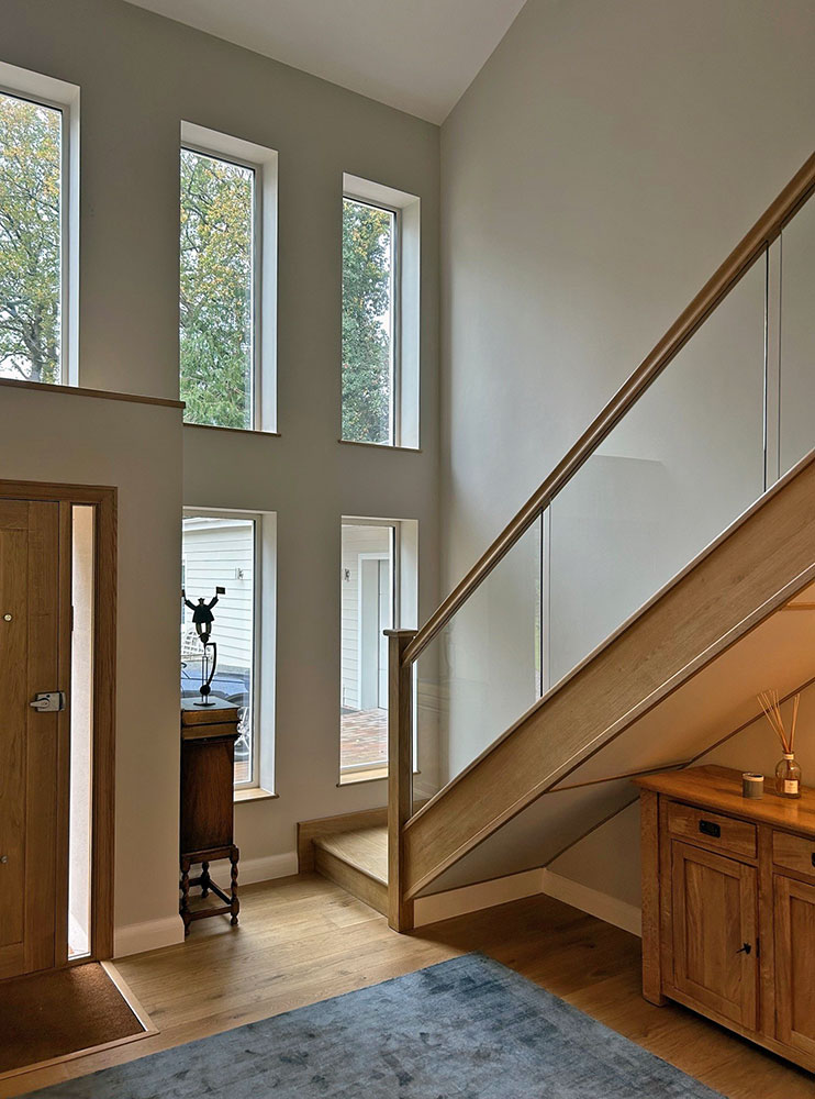 We redesigned the entire house, removing walls to optimise space and light, bringing it up to modern day living standards. A particular feature in need of modernisation was the large atrium and windows seen upon entering the house. We gave this space much larger windows giving beautiful views over the fields and allowing light into the main entrance space.