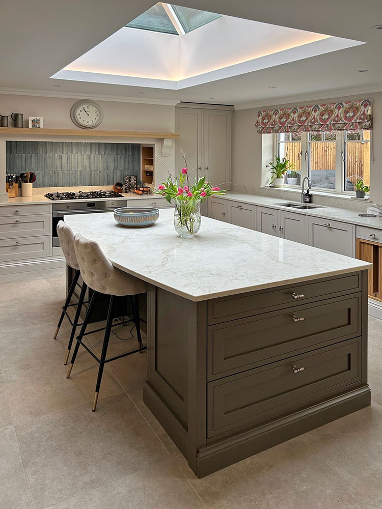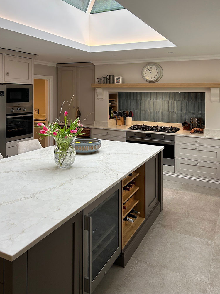 The kitchen area was increased in size to create a large kitchen and dining area with doors onto the garden patio. A large pantry and separate utility room as well as a boot room were designed with access from the side of the house.